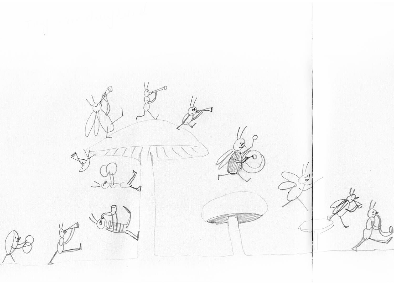 On the forest floor, tiny insects gather to play their instruments and fill the woods with music. Painted in watercolour and mixed media, this illustration captures the joyful rhythm of nature’s smallest musicians.